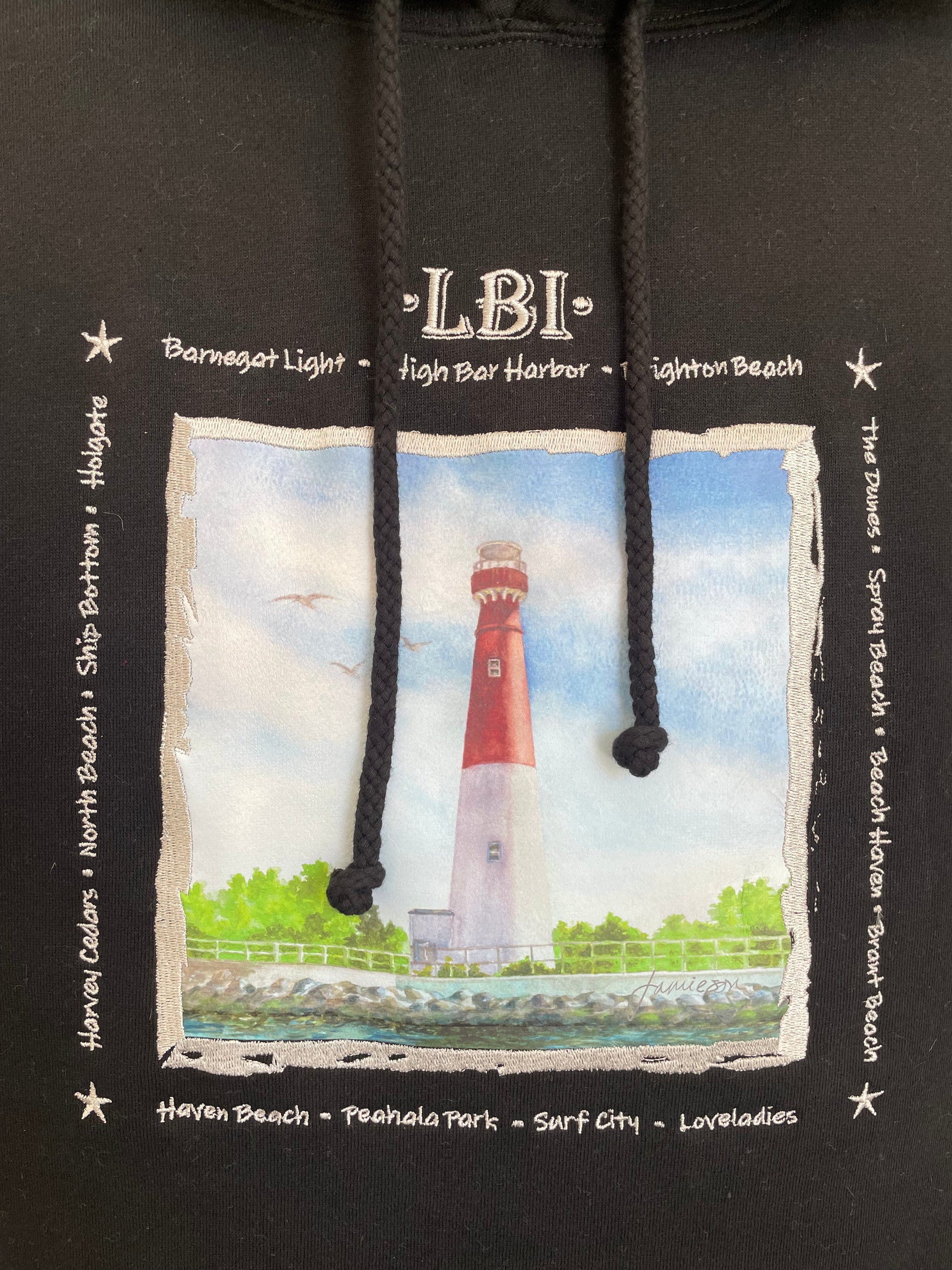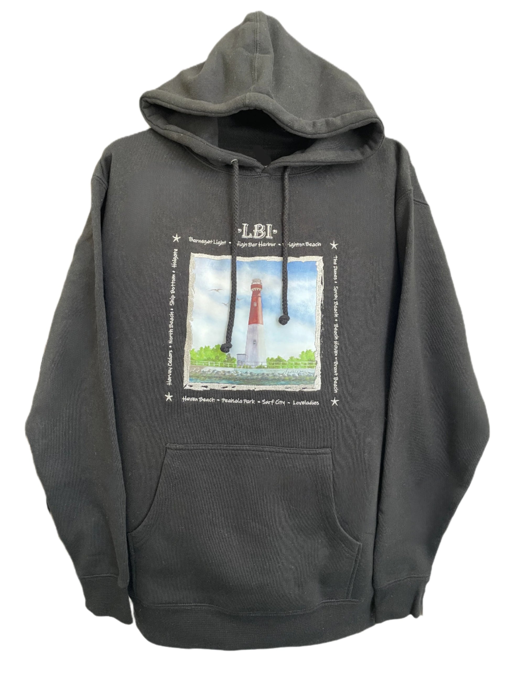 Our LBI sweatshirts are premium heavyweight quality, made of 70% Cotton/ 30% Polyester. Each is embellished with the artist's Old Barney artwork, embroidered with LBI script, bordered with the island's township names. These cozy garments have a fleece lined hood and front pocket to keep you warm on those chilly beach nights. Free Shipping! Please allow up to 2-3 weeks to ship.
