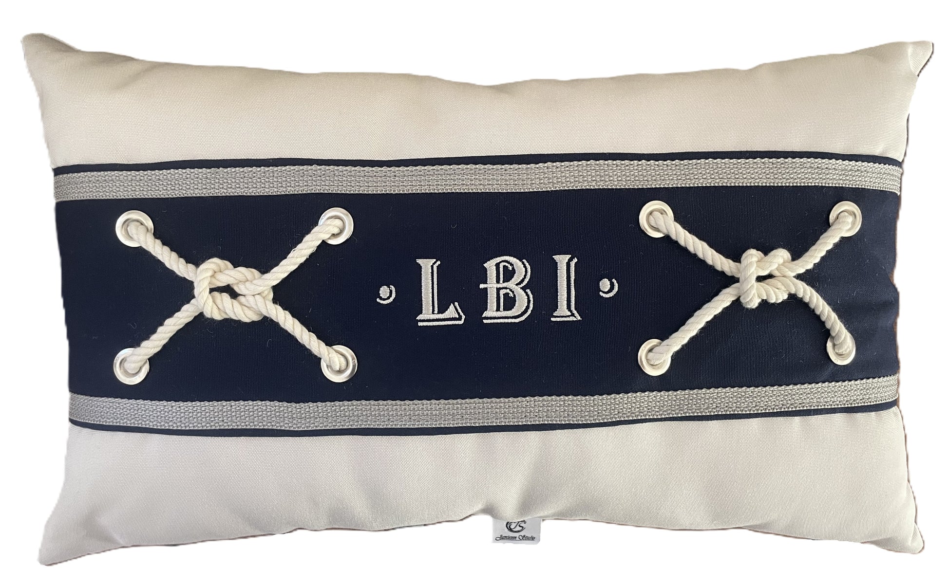 Beautifully handcrafted in the US, each pillow is luxurious, as well as durable, designed for indoor/ outdoor use. The outer sham is made from Sunbrella fabric, trimmed with nautical rope and embellished with LBI embroidered detail. The outdoor pillow insert is made of soft woven fill, removable for easy cleaning. Free Shipping! Please allow up to 2-3 weeks to ship.