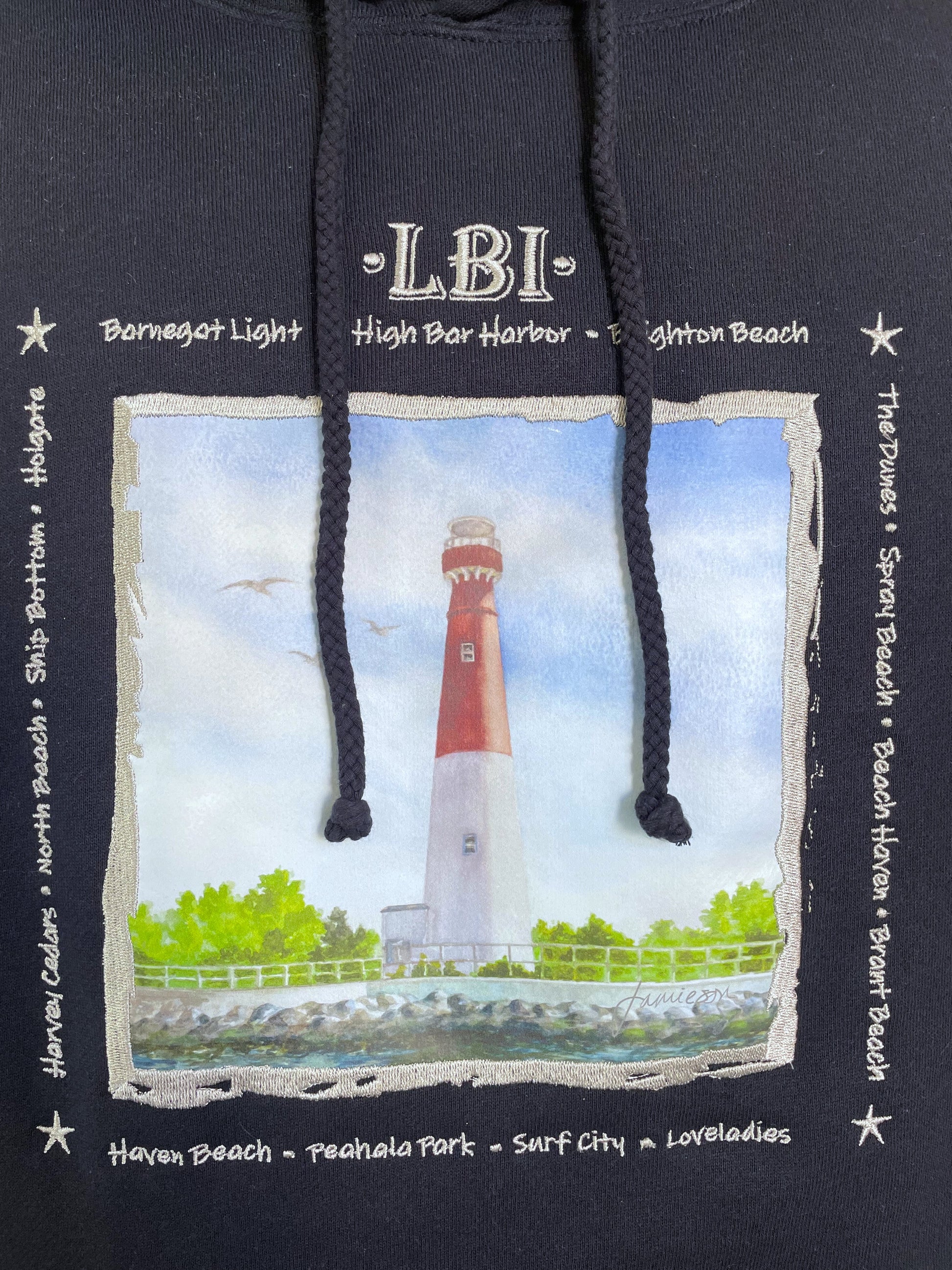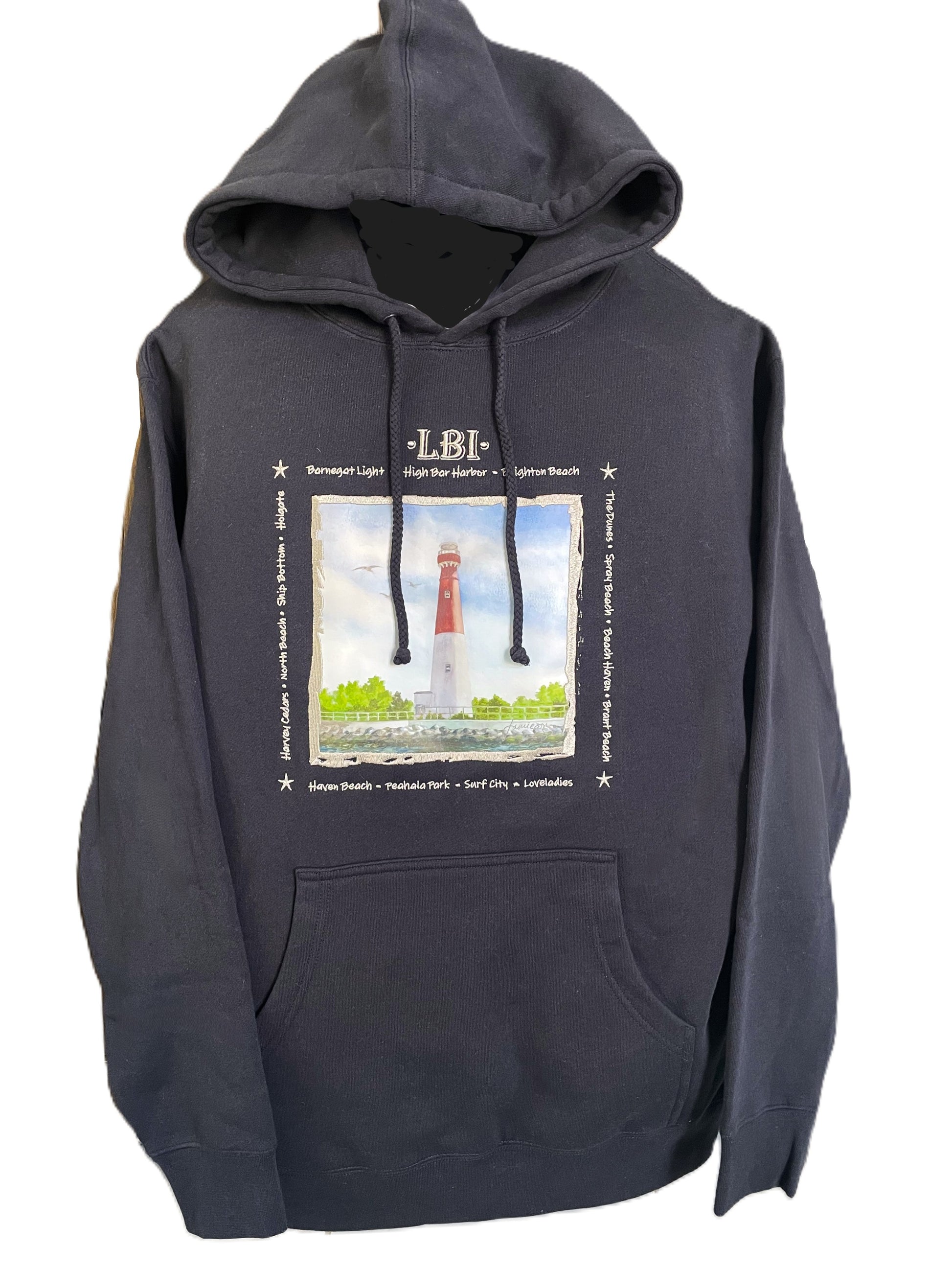 Our LBI sweatshirts are premium heavyweight quality, made of 70% Cotton/ 30% Polyester. Each is embellished with the artist's Old Barney artwork, embroidered with LBI script, bordered with the island's township names. These cozy garments have a fleece lined hood and front pocket to keep you warm on those chilly beach nights. Free Shipping! Please allow up to 2-3 weeks to ship.