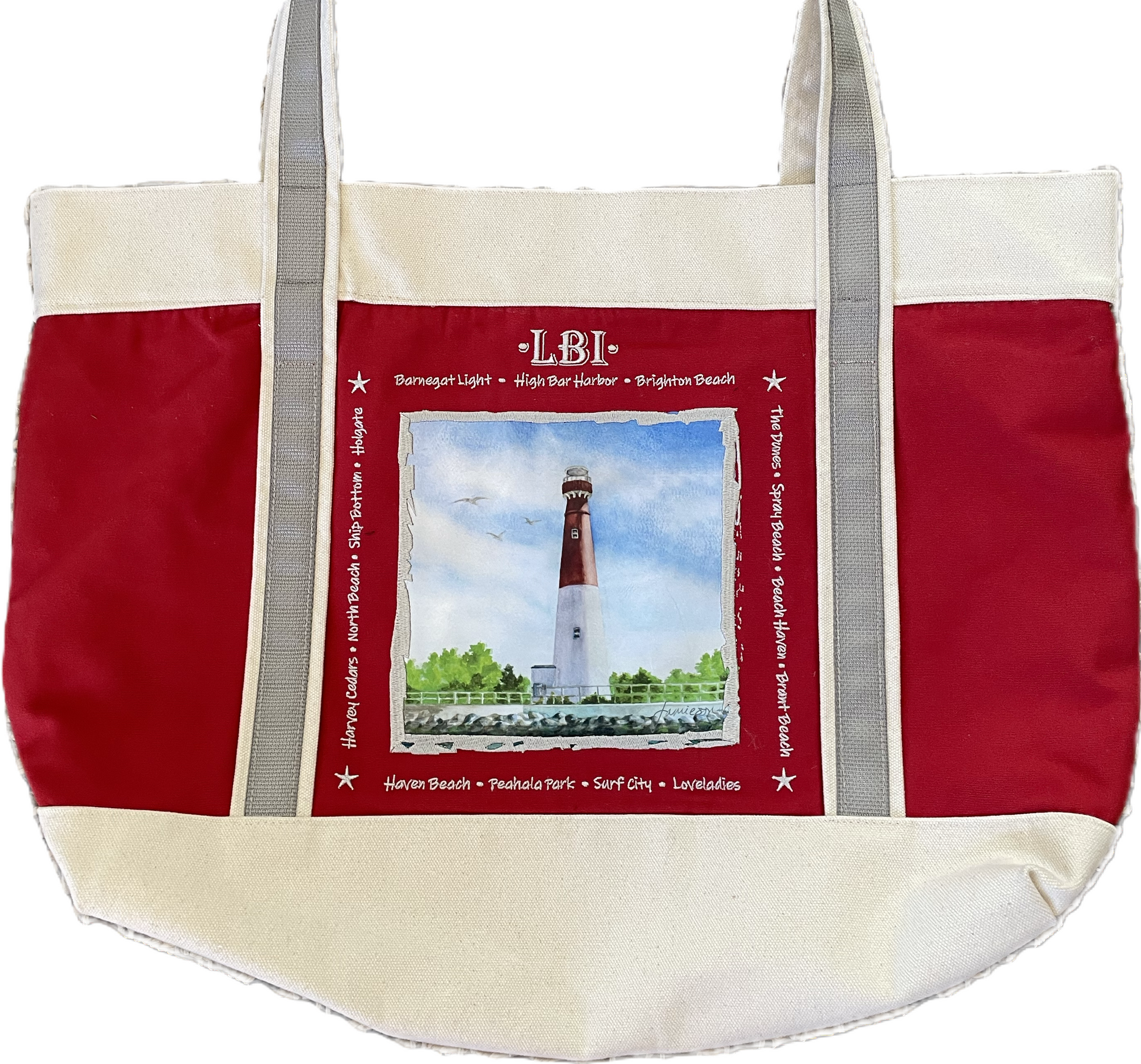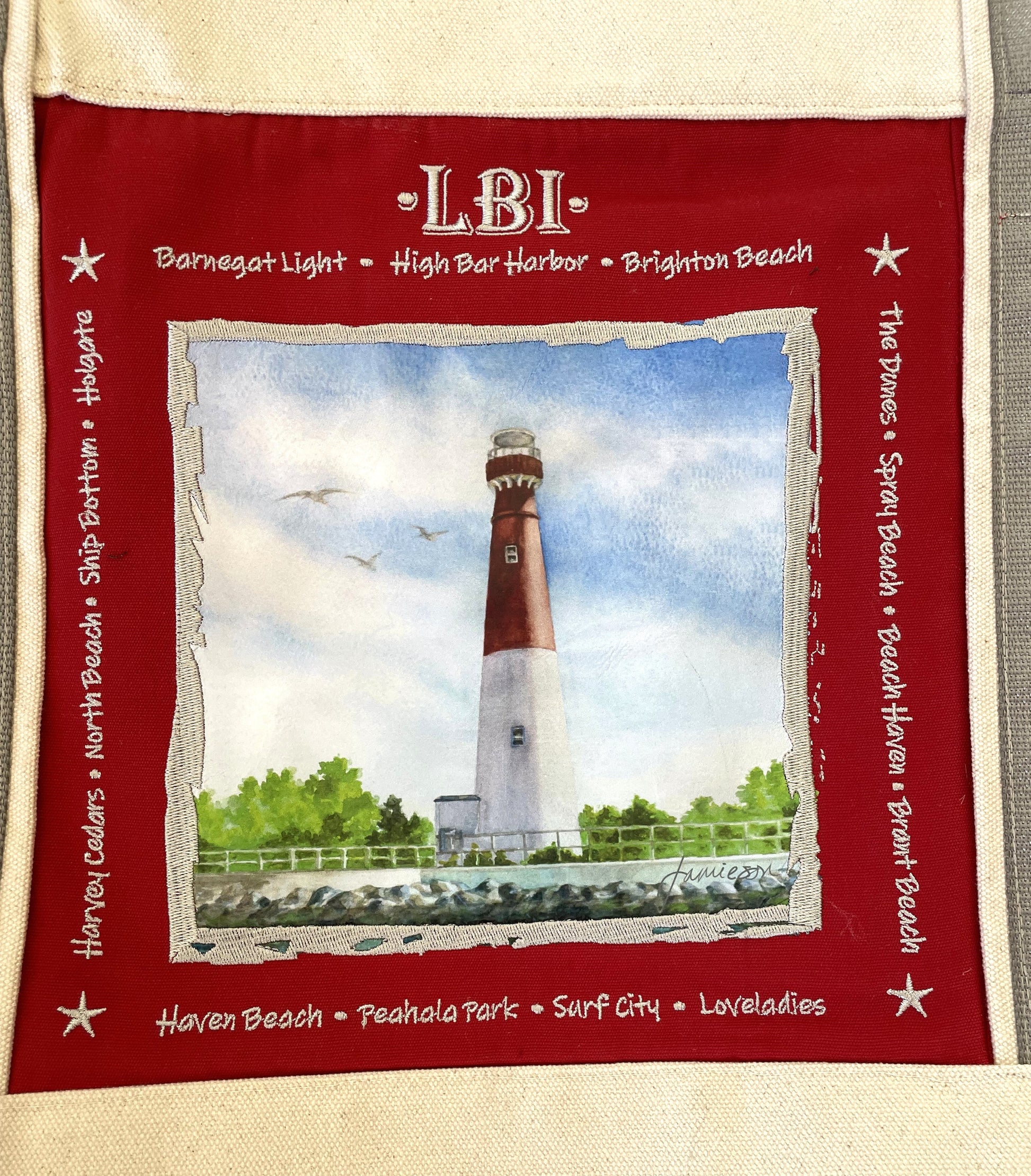 Beautifully handcrafted in the US, inspired by the artist's original painting of Old Barney. Each bag is luxurious, as well as durable, made from Sunbrella and Marine Cotton Duck fabric, lined with custom made JS logo fabric and an inside zipper. Artwork is heat transferred, outlined with fine embroidered details, embellished with LBI script and town names. Free Shipping! Please allow up to 2-3 weeks to ship.