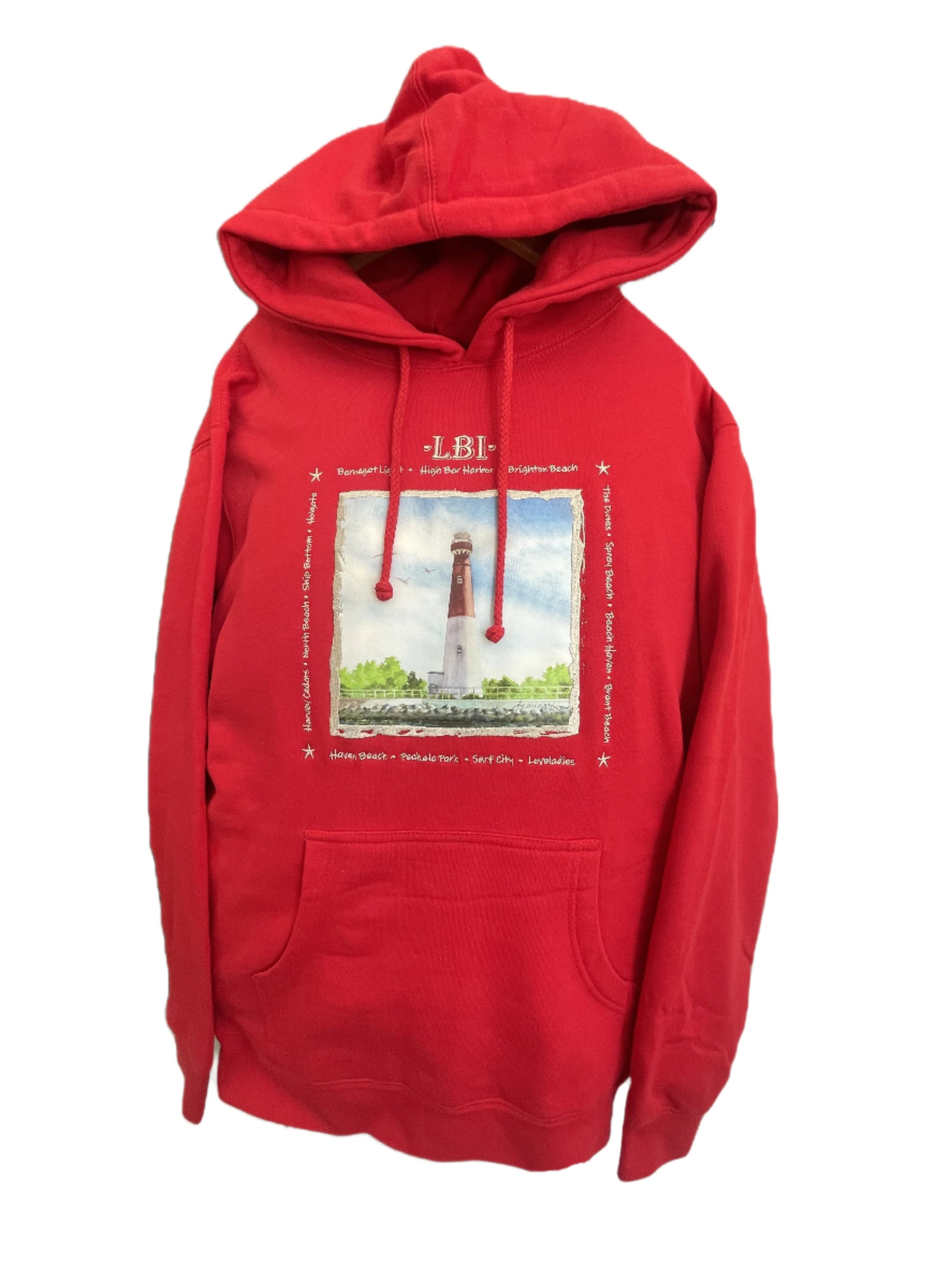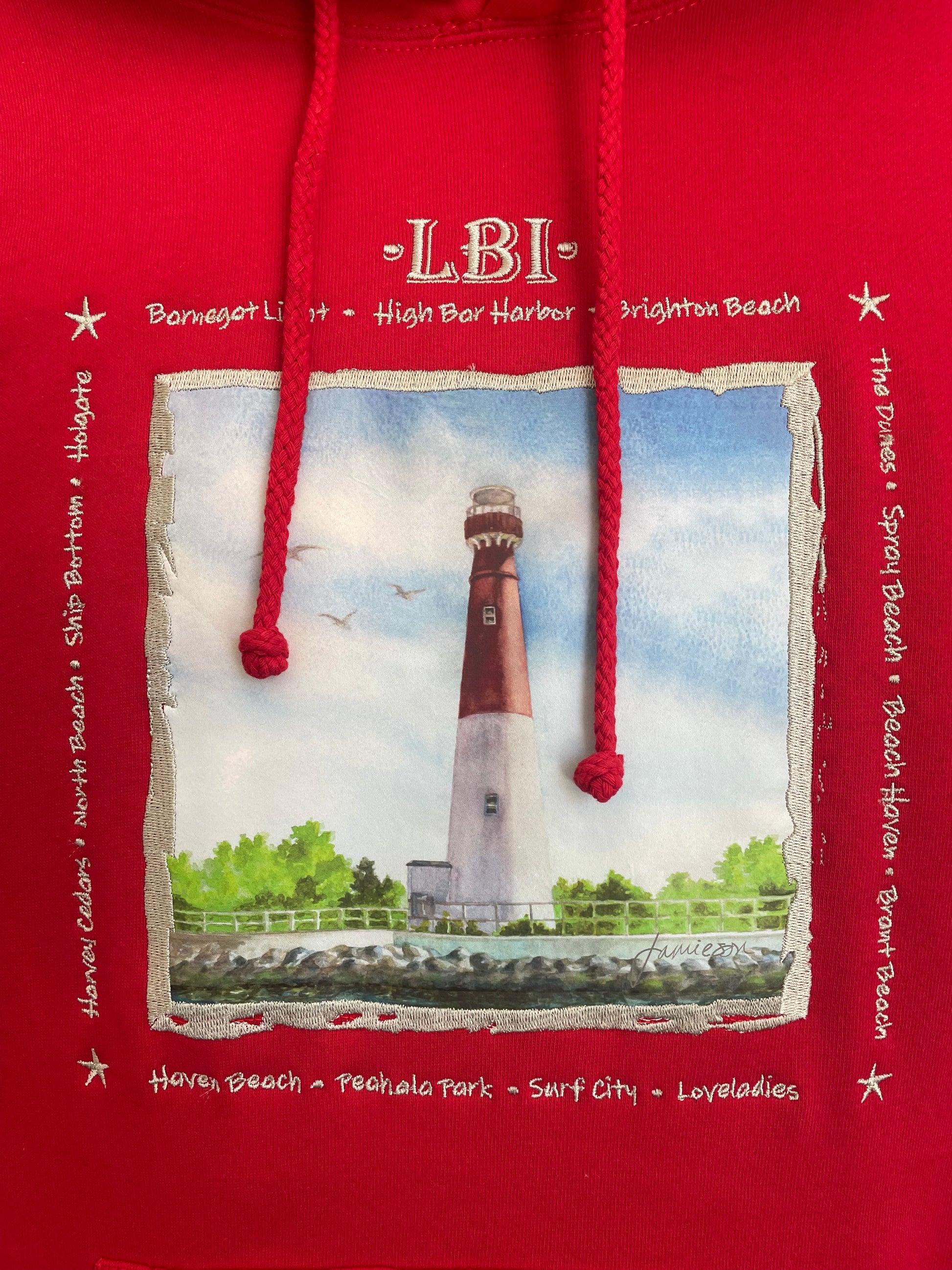 Our LBI sweatshirts are premium heavyweight quality, made of 70% Cotton/ 30% Polyester. Each is embellished with the artist's Old Barney artwork, embroidered with LBI script, bordered with the island's township names. These cozy garments have a fleece lined hood and front pocket to keep you warm on those chilly beach nights. Free Shipping! Please allow up to 2-3 weeks to ship.