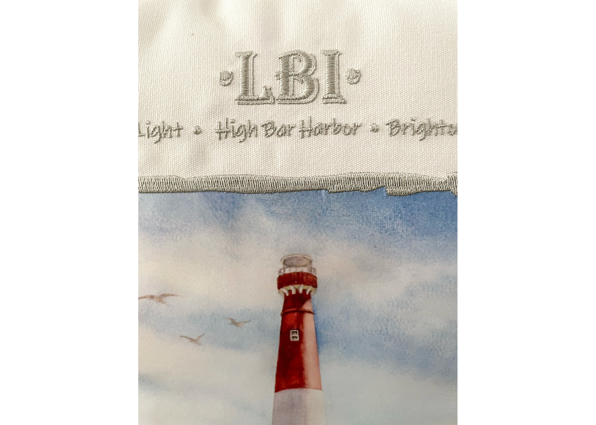 Beautifully handcrafted in the US, inspired by the artist's original painting of Old Barney. Each pillow is luxurious, as well as durable, designed for indoor/outdoor use. The outer sham is made from Sunbrella fabric, trimmed with nautical rope attached with webbed tabs, able to withstand the elements. The outdoor pillow insert is made of soft non-woven fill, removable for easy cleaning. Artwork is heat transferred, outlined with fine embroidered details, embellished with LBI script and town names. Free Shipping! Please allow up to 2-3 weeks to ship.
